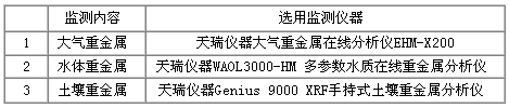 綜上所述,有色金屬礦業對環境的重金屬污染包括了大氣、水體和土壤三個方面。因此,為了全面監測有色金屬礦業環境重金屬監測系統包括:大氣、水體和土壤三個部分,選用監測儀器如下表: