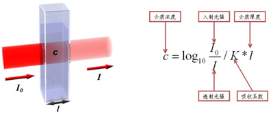 光度比色法主要是根據朗伯比爾定律,一束單色光照射于一吸收介質表面,在通過一定厚度的介質后,由于介質吸收了一部分光能,透射光的強度就要減弱。吸收介質的濃度愈大,介質的厚度愈大,則光強度的減弱愈顯著。
