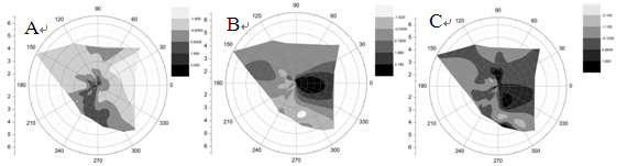 圖6 EHM-X200大氣重金屬監測儀監測數據PM2.5中元素主成分分析得到的各組分與風向關系圖。圖A是組分1(工業、生活燃料燃燒)的濃度與風向關系圖,從圖中可以看出組分1主要來源于監測點位的西南方向(深色區域);圖B是組分2(冶金工業廢氣)的濃度與風向關系圖,從圖中可以看出組分2來源于監測點自身范圍內(深色區域);圖C是組分3(揚塵)的濃度與風向關系圖,從圖中可以看出組分3主要來源于監測點位的東方及北方(深色區域)。圖中顏色深淺由淺到深代表污染的程度由小到大。