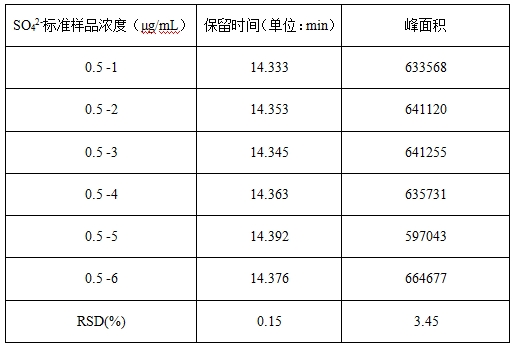 取0.5μg/L硫酸根標(biāo)準(zhǔn)溶液重復(fù)進(jìn)樣6次,考察保留時(shí)間和峰面積的重復(fù)性,RSD結(jié)果詳見表3。
