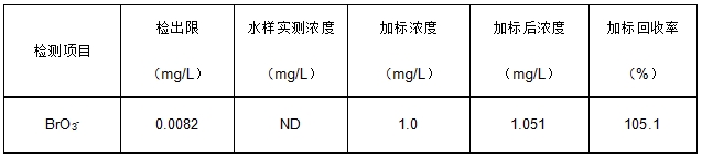 本文通過TIC-660離子色譜儀快速準(zhǔn)確的分析了瓶裝礦泉水中的溴酸鹽的含量,選擇合適比例的淋洗液濃度及流速可以很好的規(guī)避氯離子的干擾。從測試結(jié)果看,該方法檢出限低、準(zhǔn)確度高、重現(xiàn)性好,為瓶裝及桶裝飲用水的監(jiān)測提供了強有力的技術(shù)支撐。