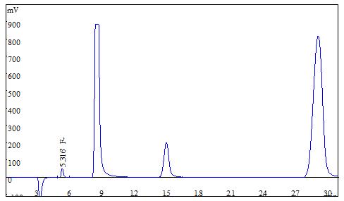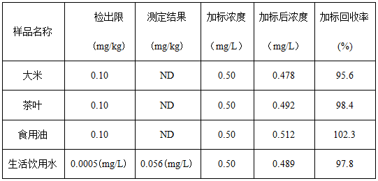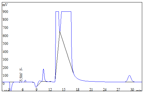 將大米、茶葉試樣分別粉粹后過篩,各稱取0.25g(精確至0.0001g),于氧彈燃燒儀進(jìn)行燃燒,冷卻后定容,經(jīng)0.22μm的水系濾膜過濾后上機(jī)得到樣品譜圖,如下圖3、圖4所示;食用油樣品直接稱重后進(jìn)行氧彈燃燒,測試得到的譜圖如圖5所示;生活飲用水直接上機(jī)后得到樣品譜圖詳見圖6。其中大米、茶葉、食用油中氟離子的測定結(jié)果均低于方法檢出限,同時對4種試樣進(jìn)行了加標(biāo)處理,加標(biāo)回收率在95.6%~102.3%之間。測試數(shù)據(jù)詳見表2。